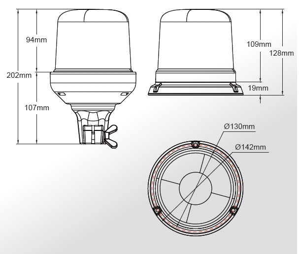 -Három csavaros felfogatással: teljes magasság - 128 mm (lámpa - 109 mm, fogatás - 19 mm)