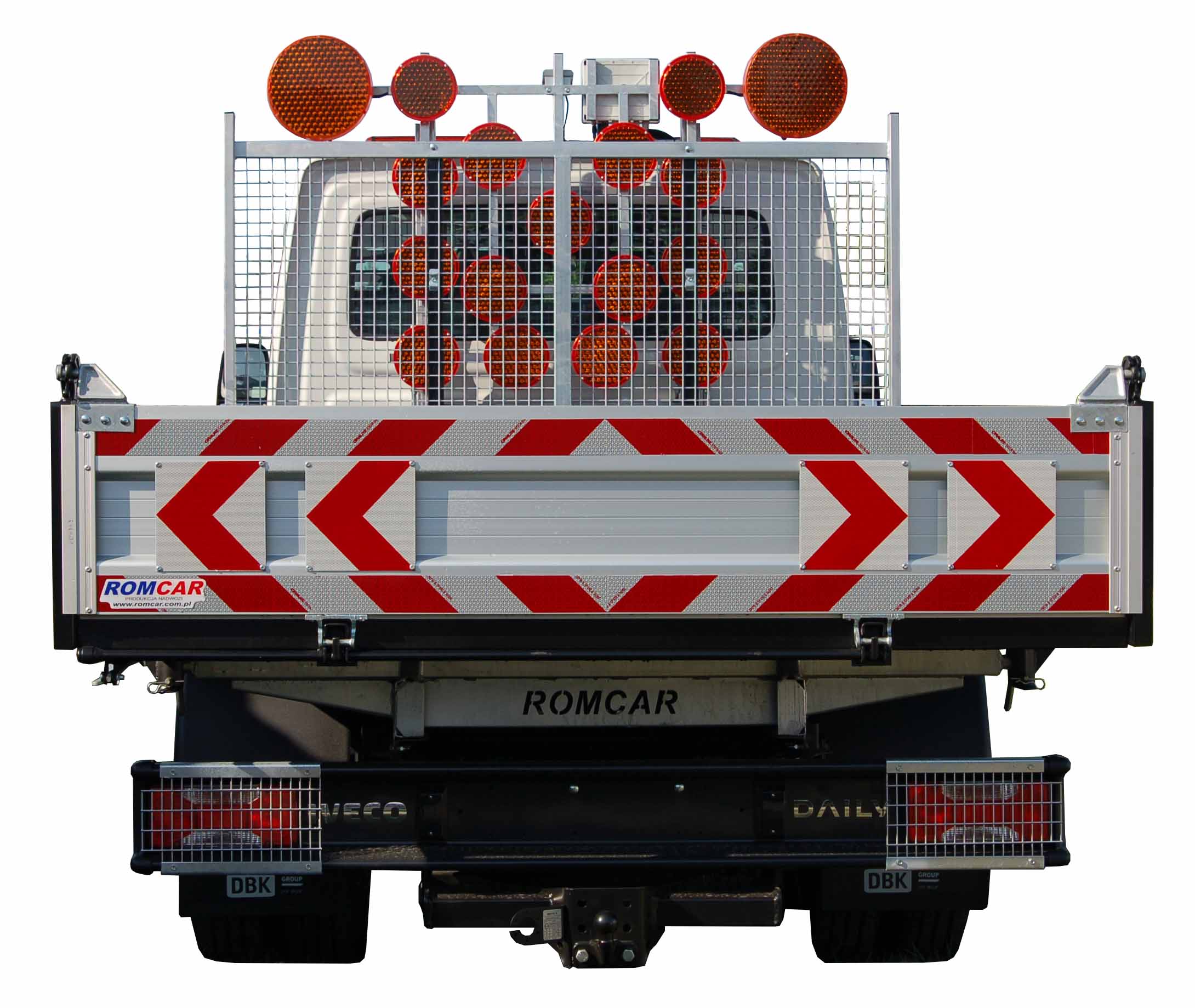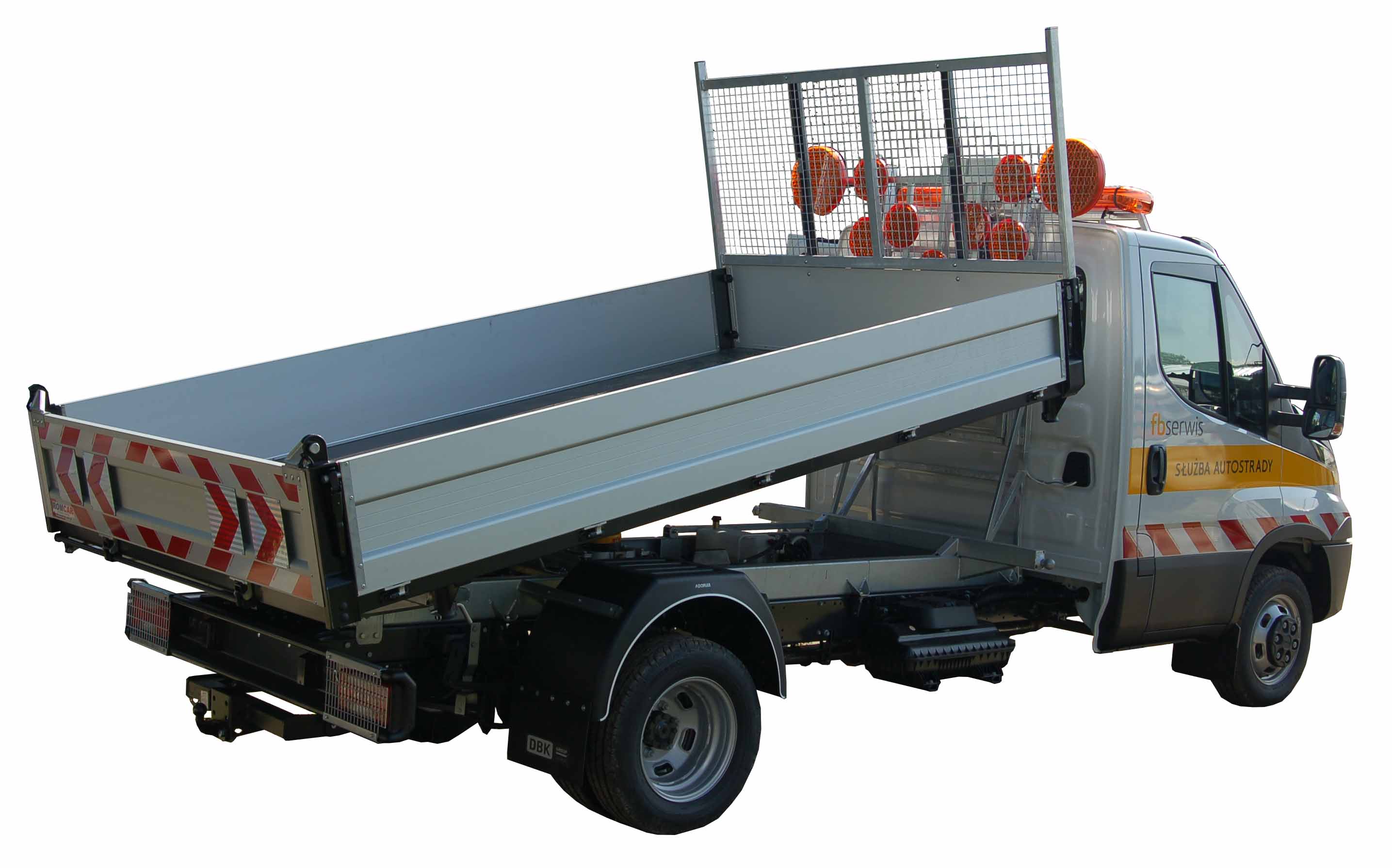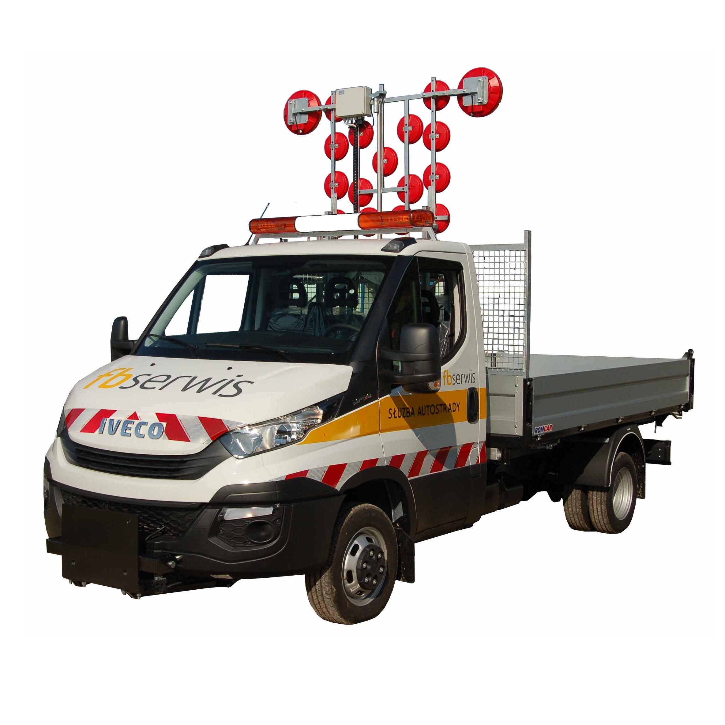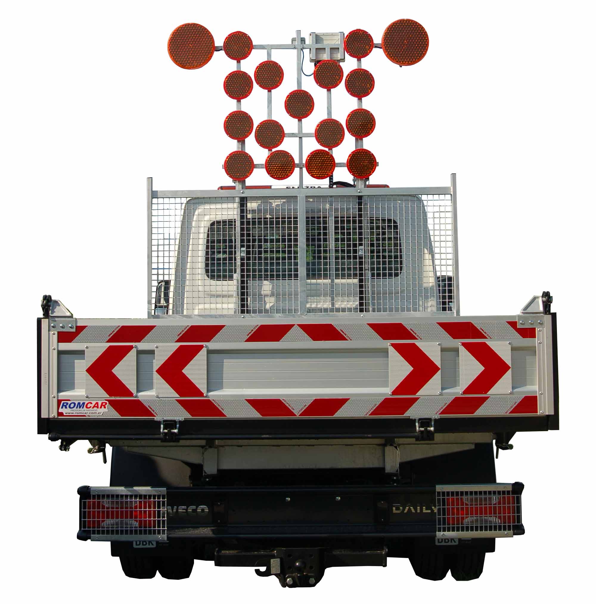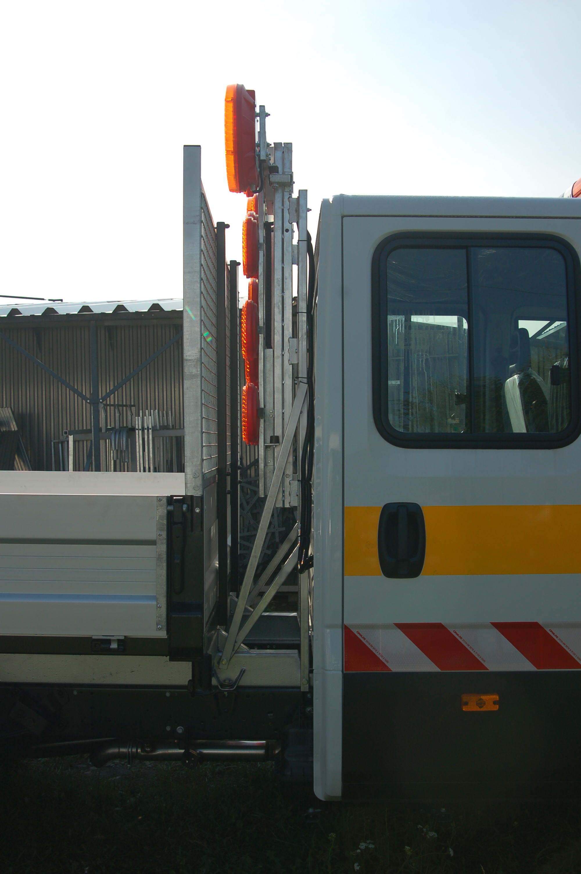 Plató mögül hidraulikusan felemelkedő forgalom terelő tábla.