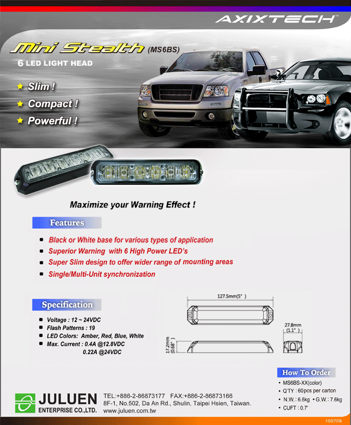 Kül- vagy beltérbe szerelhető egység. Jelöletlen járművek kiegészítő villogójaként ajánlott. Több lámpa szinkronizálásának lehetősége. Rögzítése csavarozással vízszintes sík felületre, vagy szorítócsavarral motorháztető és csomagtérfedél peremére.